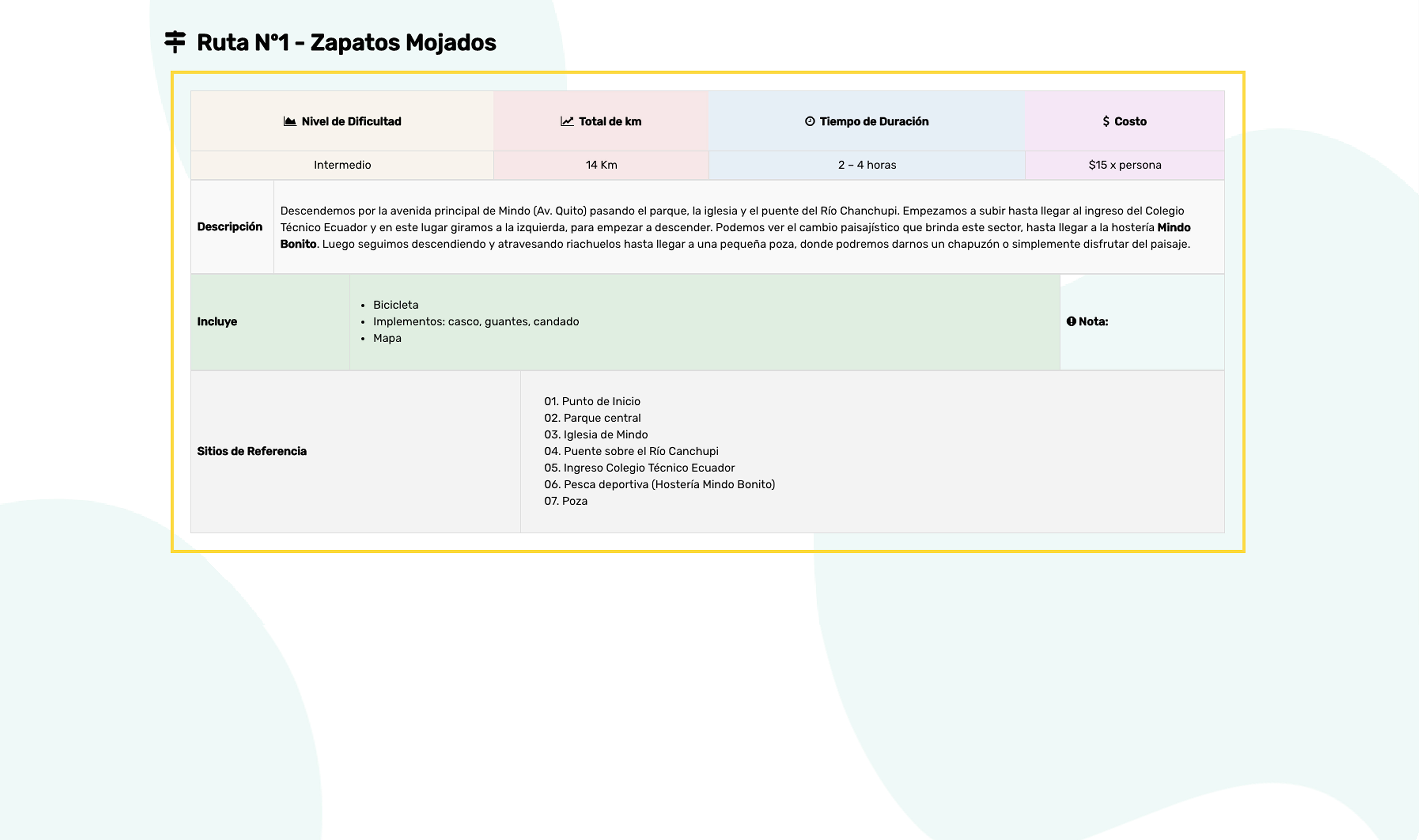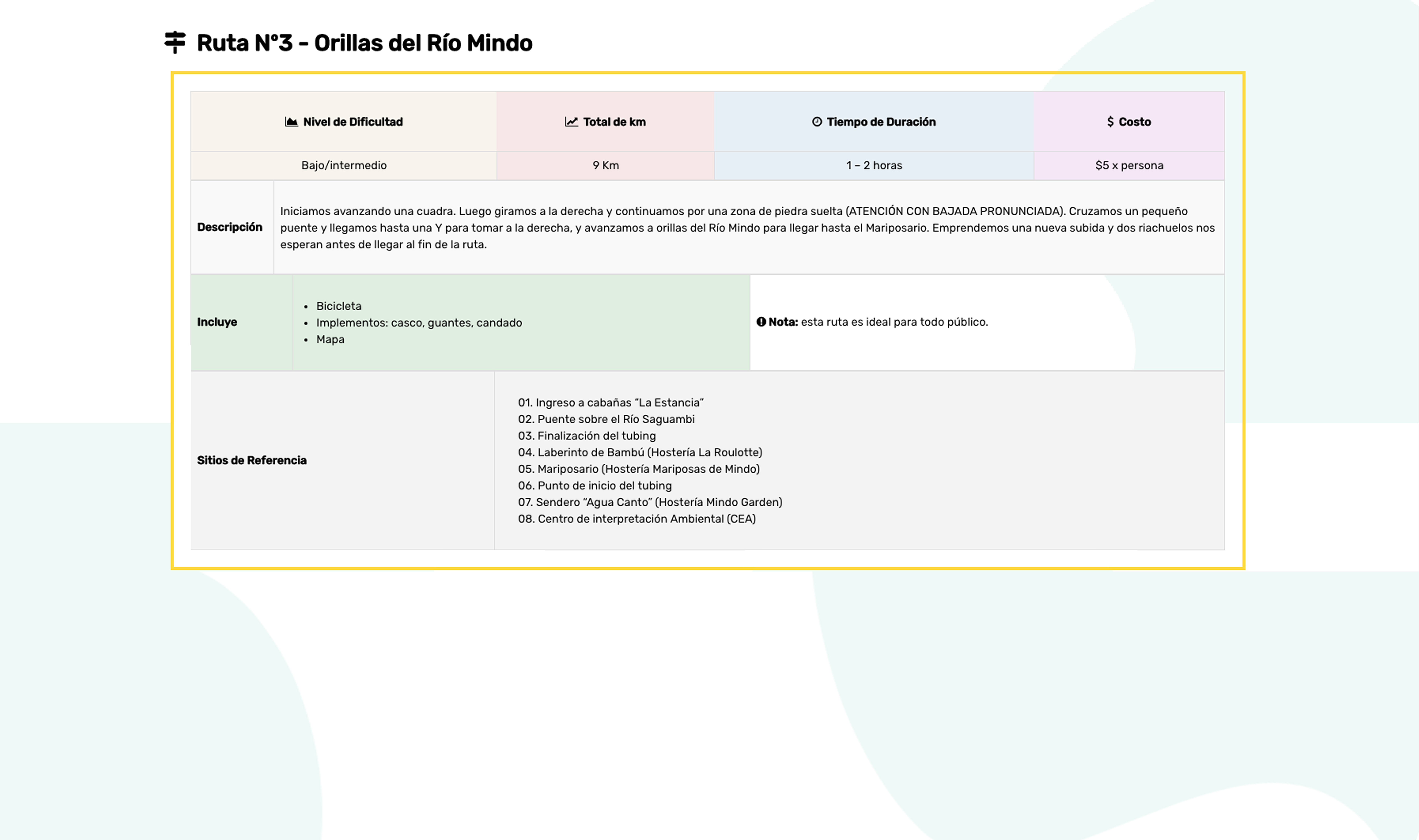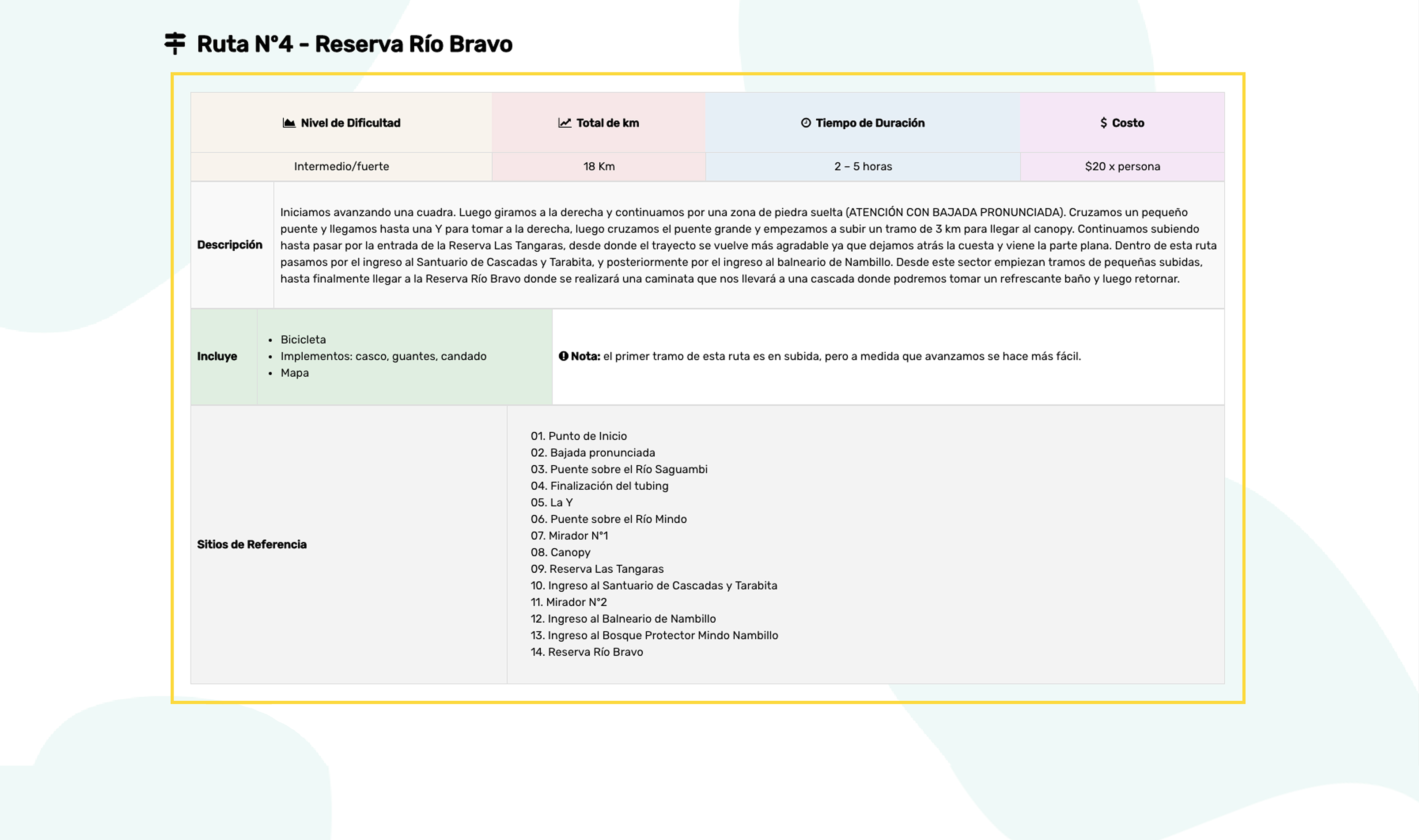 Iniciamos avanzando una cuadra. Luego giramos a la derecha y continuamos por una zona de piedra suelta (ATENCIÓN CON BAJADA PRONUNCIADA). Cruzamos un pequeño puente y llegamos hasta una Y para tomar a la derecha, luego cruzamos el puente grande y empezamos a subir un tramo de 3 km para llegar al canopy. Continuamos subiendo hasta pasar por la entrada de la Reserva Las Tangaras, desde donde el trayecto se vuelve más agradable ya que dejamos atrás la cuesta y viene la parte plana. Dentro de esta ruta pasamos por el ingreso al Santuario de Cascadas y Tarabita, y posteriormente por el ingreso al balneario de Nambillo. Desde este sector empiezan tramos de pequeñas subidas, hasta finalmente llegar a la Reserva Río Bravo donde se realizará una caminata que nos llevará a una cascada donde podremos tomar un refrescante baño y luego retornar.